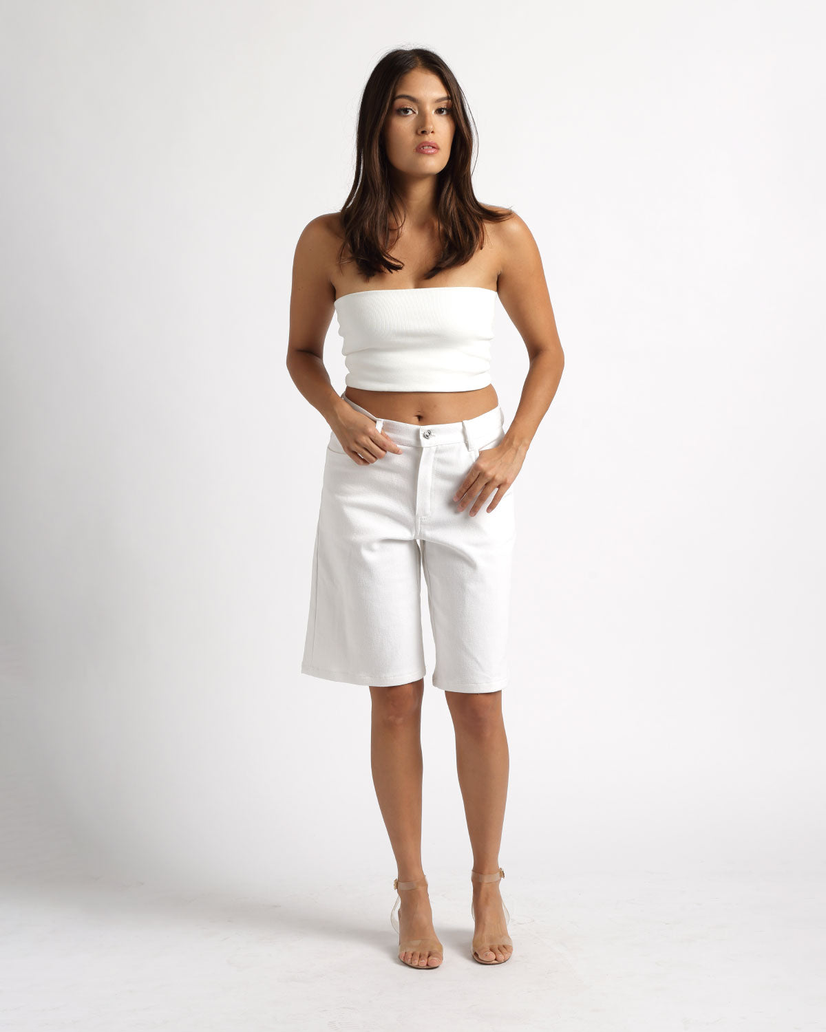 Effortlessly blending comfort and style, these premium white denim Bermuda shorts are a wardrobe essential for the modern trendsetter. Crafted from high-quality denim with just the right amount of structure, they offer a flattering fit that moves with you. The mid-length cut delivers a sleek, fashion-forward silhouette, while the white shorts pair perfectly with anything from casual tanks to tailored blouses.